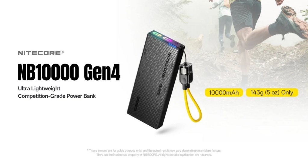The NB10000 Gen4 Ultra Lightweight Competition-Grade Power Bank weighs only 143g (5 oz) with a 10,000mAh capacity. It comes with a lanyard charging cable and supports IPX7 waterproofing and 22.5W fast charging. Featuring an innovative Knock to Wake function along with RGB positioning lights, it ensures effortless use even at night.